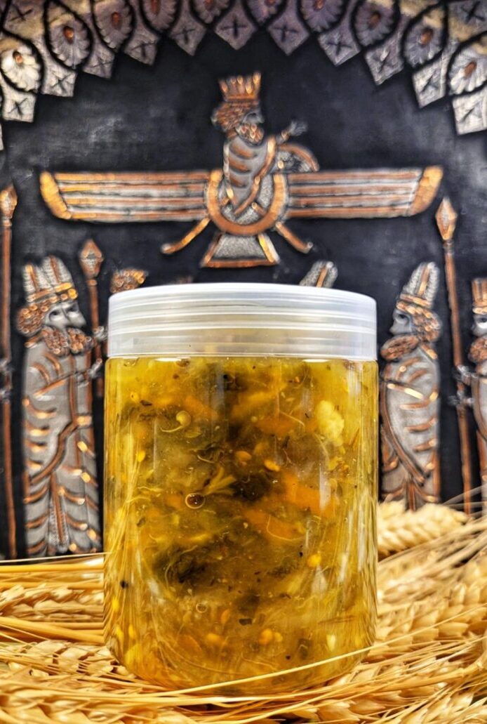 Handcrafted traditional pickles (Torshi) featuring a vibrant blend of vegetables and herbs preserved in aromatic vinegar and spices.